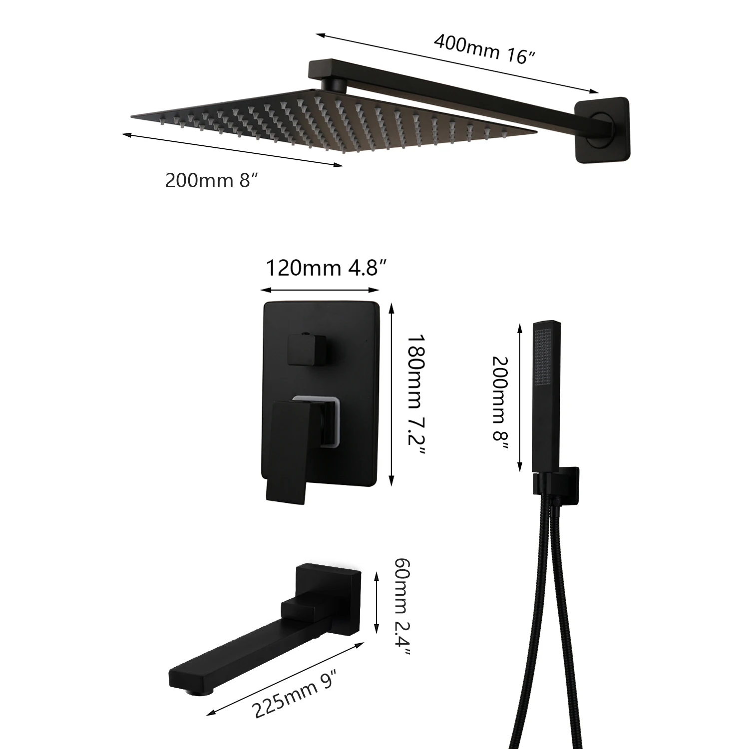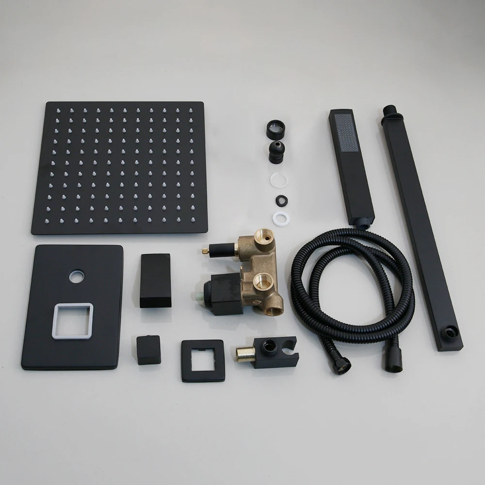 Bathroom Matte Black Shower Faucet Kits Rainfall Tub LED Bathtub Rain Square Shower Head & Swivel Spout Shower Set
